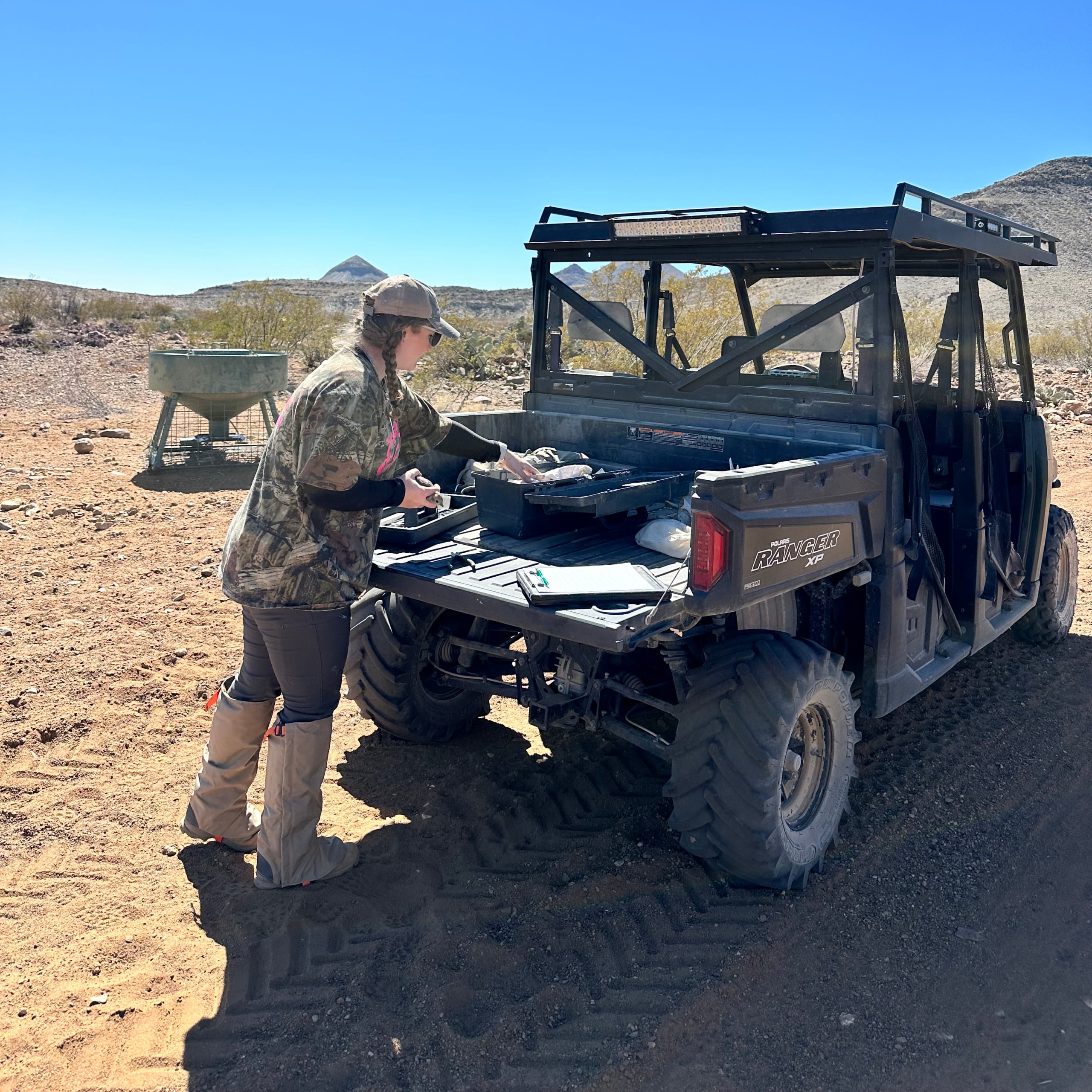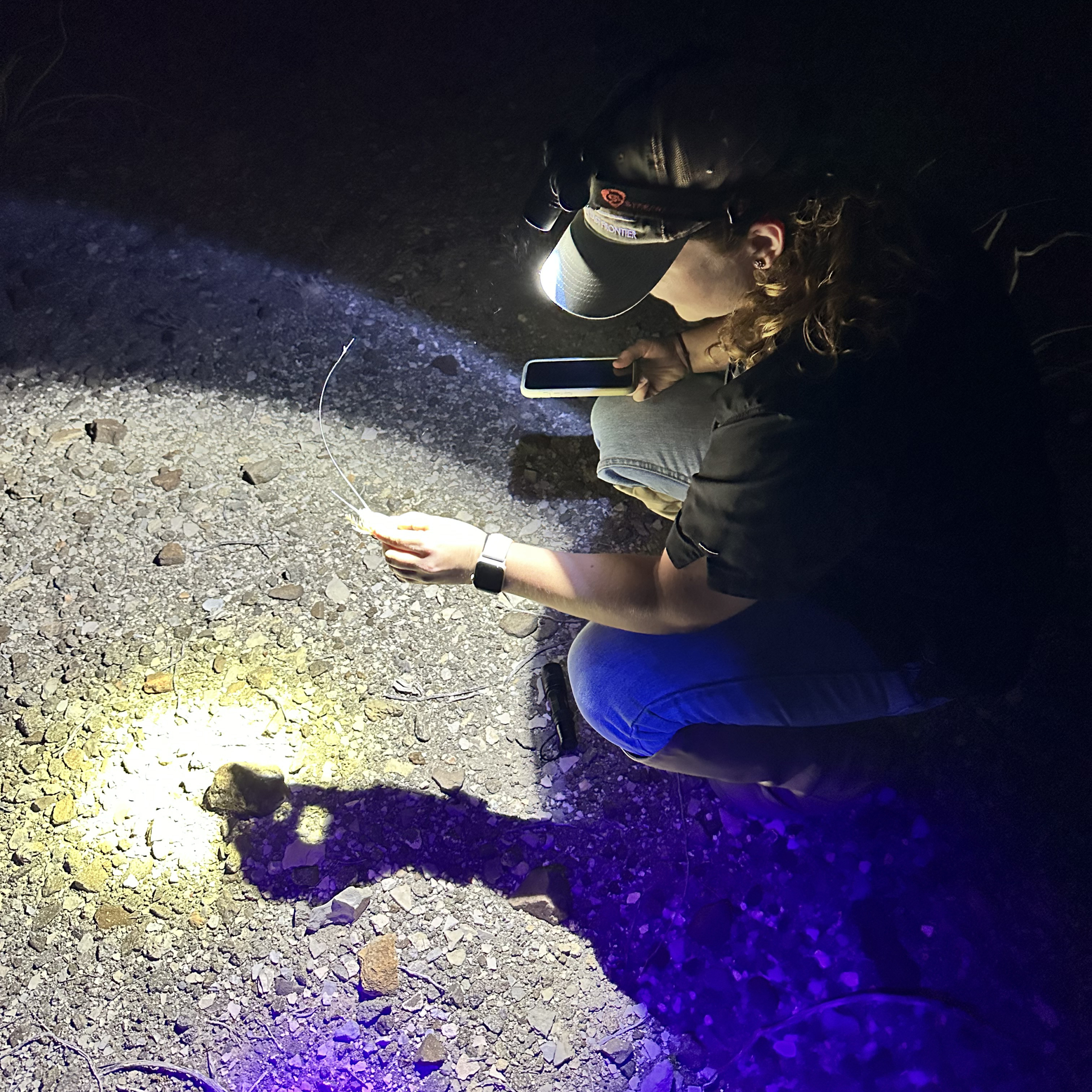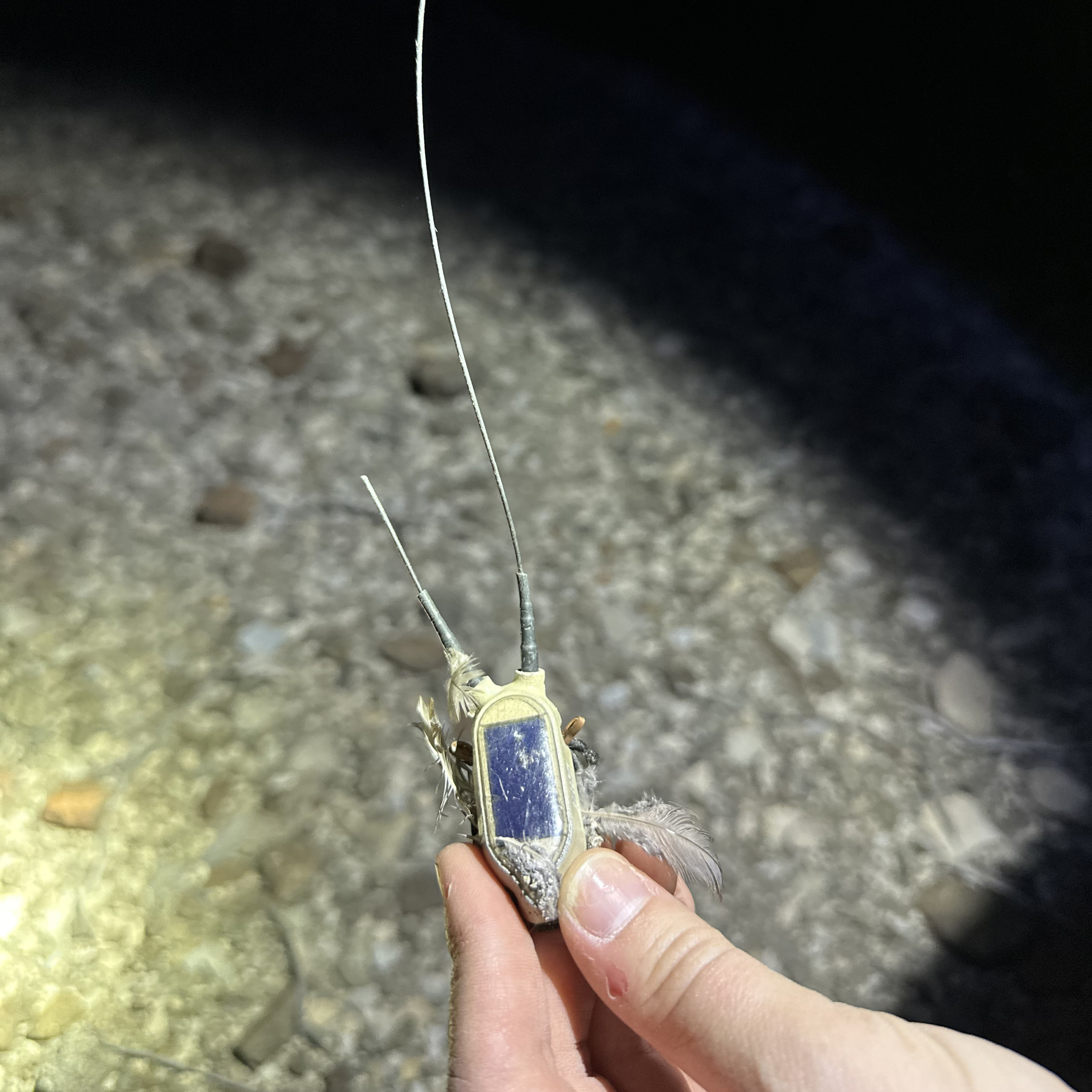 Since April 2025, Hayley has captured 189 Scaled quail, 48 of which were fitted with backpack-style Global Positioning System (GPS) tags. These backpack tags can be programmed by the user to provide GPS data at fixed intervals, depending on the questions at hand. Hayley configured her tags to collect location data during the day and night for a whole year. Conveniently, these tags include solar capabilities to keep them powered over long collection periods. Hayley applied a coat of UV-light reactive paint to each tag before deployment so that she could locate them later. Upon quail mortality due to predation or natural causes, its backpack signals that it is stationary and ready for retrieval. The tags are about the size of your thumb, weigh less than seven grams, and are earth-toned, so you can imagine how difficult it is to find one on the desert floor during the day. Hayley downloaded these GPS points and spent many nights traversing the landscape with a UV flashlight to locate dropped tags.